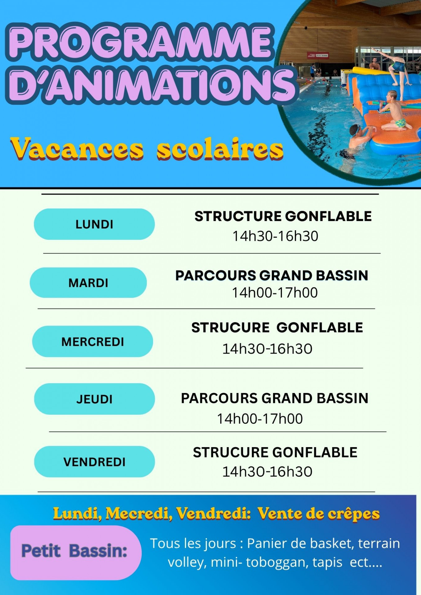 Bassin ludique : 14:00 - 17:45 | Bien-être : 14:00 - 19:00